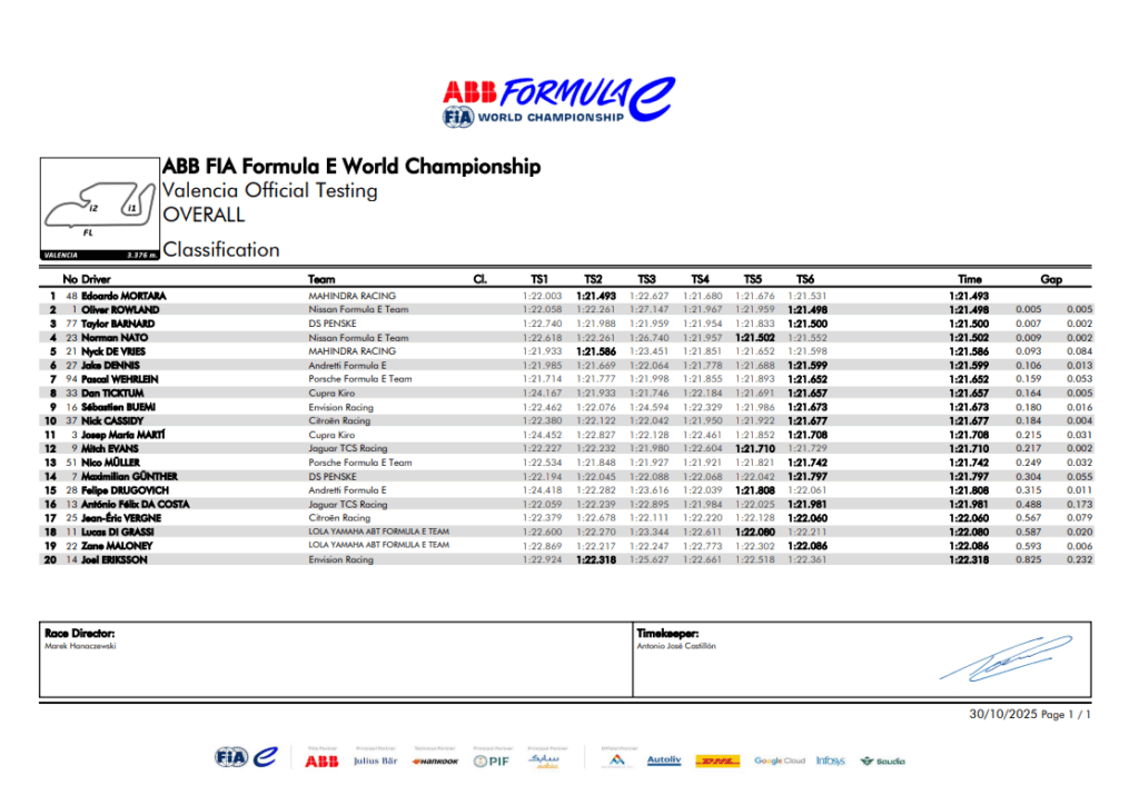 A Nissan e a Mahindra, que competem com apenas uma equipe nesta temporada – suas respectivas equipes de fábrica – foram as únicas fabricantes de motores a colocar dois carros entre os cinco primeiros colocados na classificação geral da semana. O outro carro de Barnard, da DS Penske, equipado com motor Stellantis, foi obtido graças à sua melhor volta no último dia.