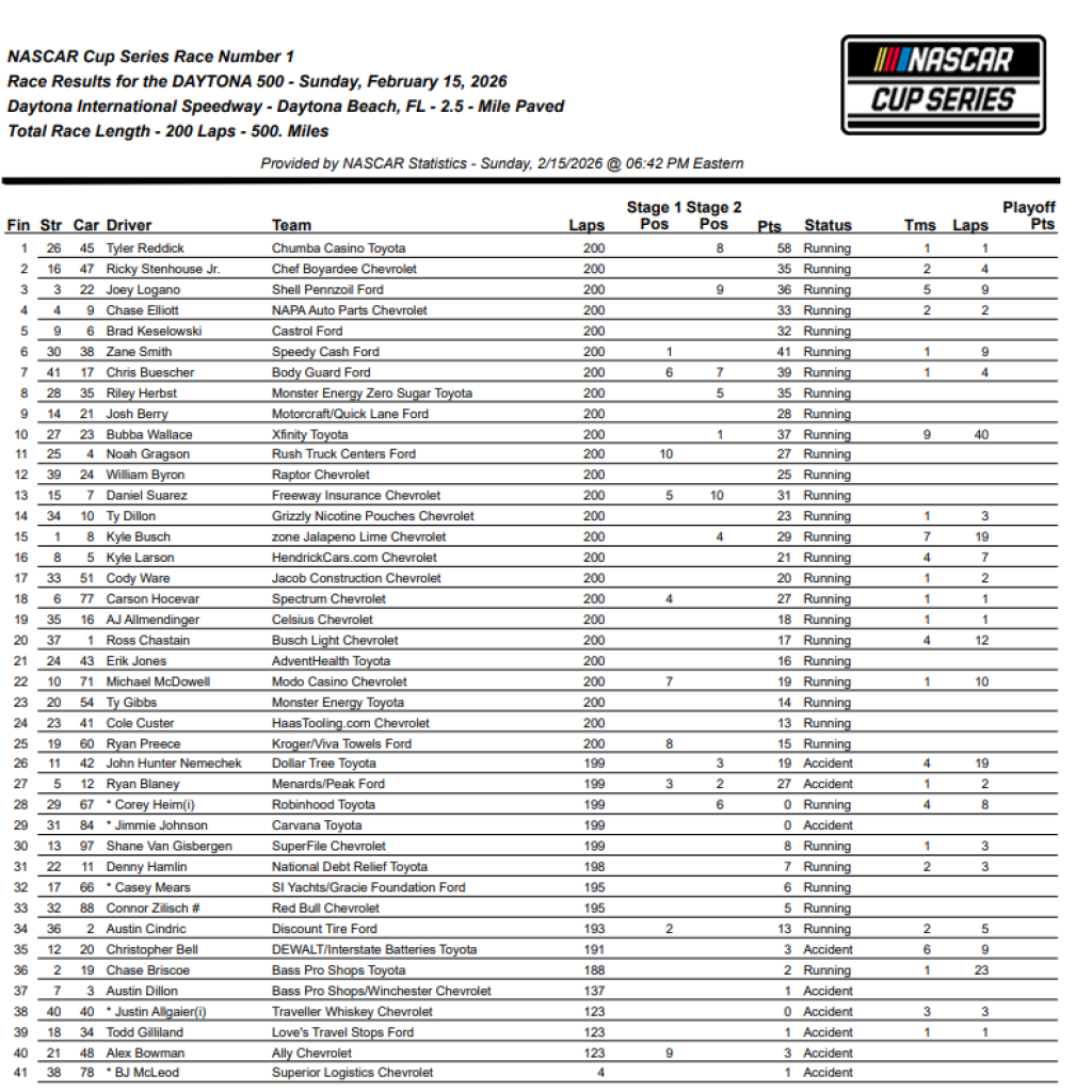 Enquanto a pista explodia em caos atrás dele, quando Herbst tentou uma manobra arriscada e desastrosa sobre Brad Keselowski e um grupo de carros deslizou lateralmente pela linha de chegada, Reddick já comemorava uma vitória por 0,308 segundos sobre Ricky Stenhouse Jr., vencedor das 500 Milhas de Daytona de 2023.