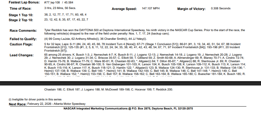 Reddick foi o 25º líder diferente — um recorde para a corrida — e a única volta em que liderou foi a última.