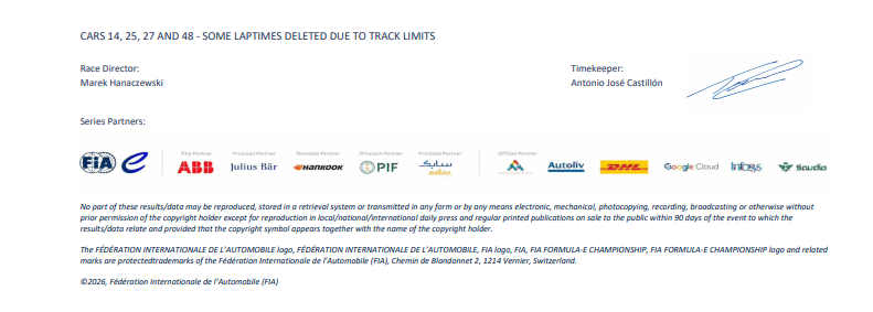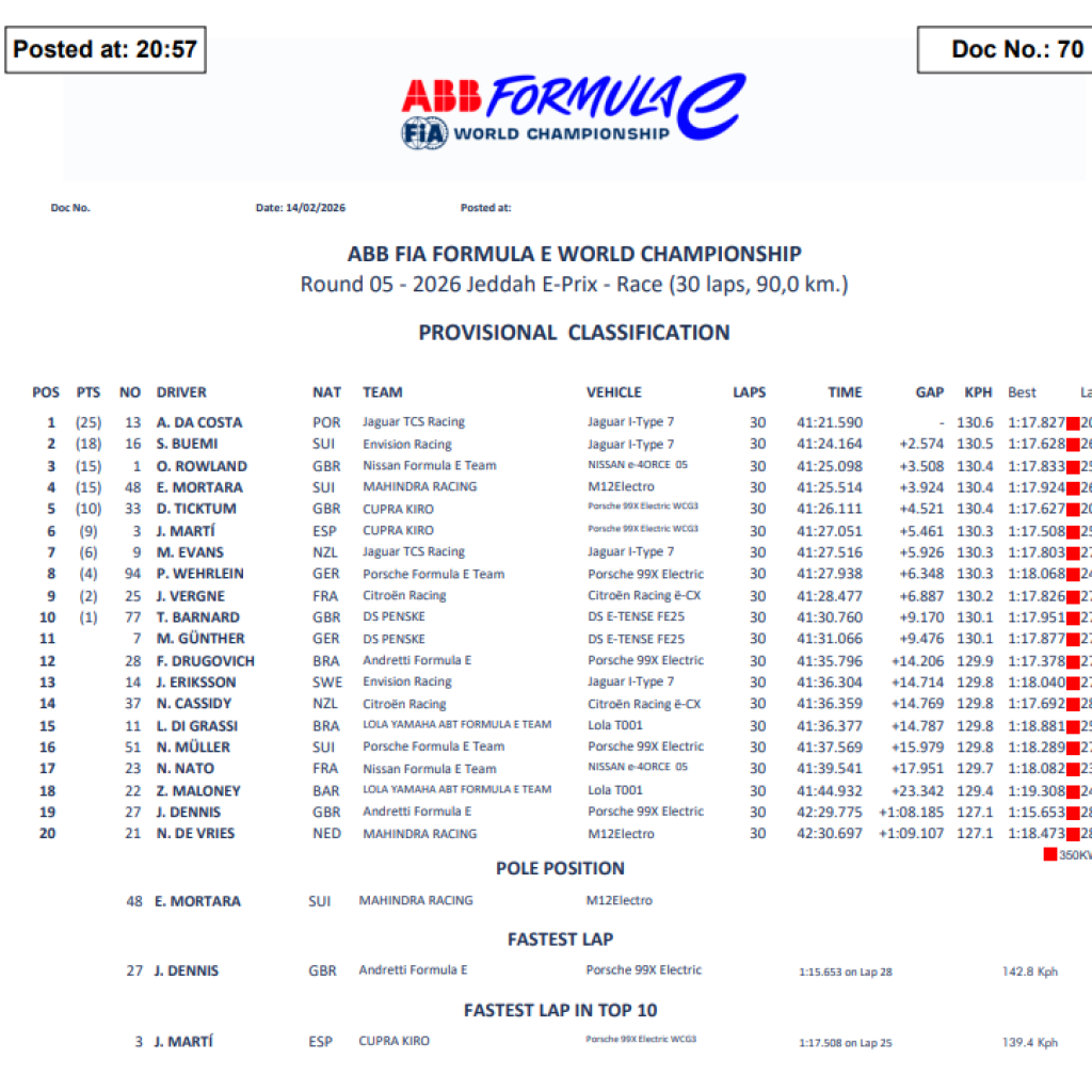 Mortara teve que se contentar com o quarto lugar, já que não aproveitou ao máximo seu segundo Modo de Ataque – que durou seis minutos – para recuperar a posição, enquanto a Cupra Kiro conquistou sua primeira dobradinha na zona de pontuação da temporada, com Dan Ticktum em quinto e Pepe Marti em sexto.
