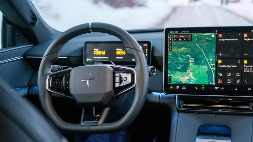 Aqui é onde a Polestar claramente tenta seguir a estratégia da Tesla, para o bem ou para o mal. Se você é fã de botões físicos, este não é o carro elétrico para você. Tirando um botão de volume semi-útil que também funciona como botão de reproduzir/pausar e alguns controles familiares no volante, tudo é feito através da tela sensível ao toque horizontal de 15,4 polegadas.