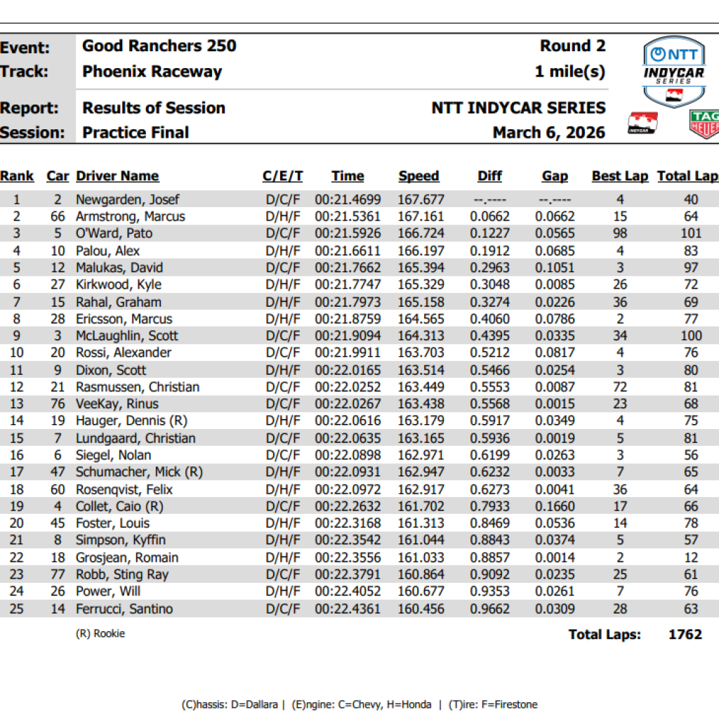 Os pilotos da IndyCar tiveram 50 minutos finais para ajustar e melhorar seus carros antes da Good Ranchers 250 de sábado no Phoenix Raceway e, após o treino livre da tarde de sexta-feira, Josef Newgarden, da Team Penske, provou ser o mais rápido com o Chevrolet nº 2 (167,677 mph).