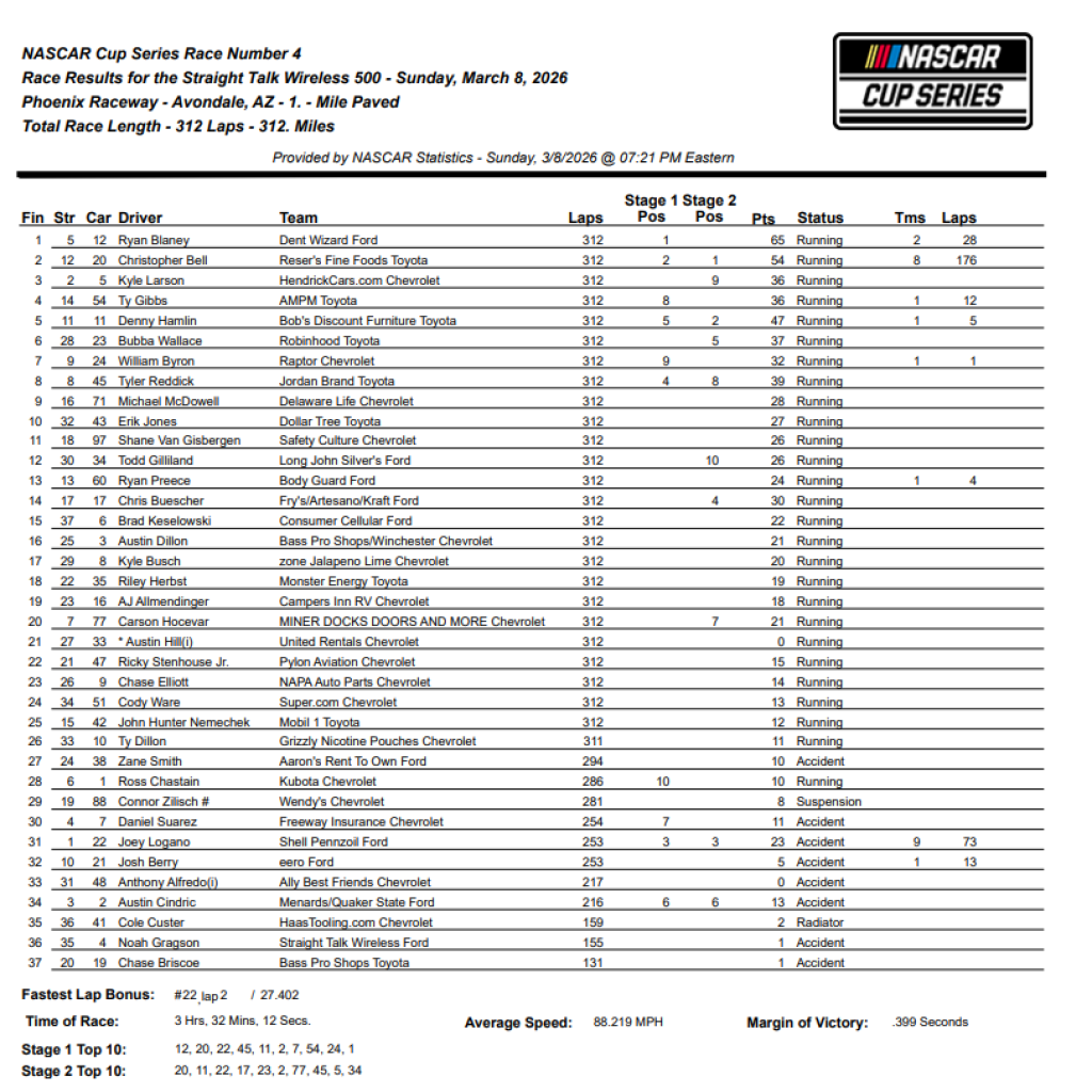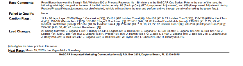 Vencedor da etapa de primavera em Phoenix, Bell não demorou a retomar o ritmo. Ele liderou a prova oito vezes, totalizando 176 das 312 voltas. Estava com mais de três segundos de vantagem sobre Blaney quando a bandeira amarela foi acionada a 25 voltas do fim.