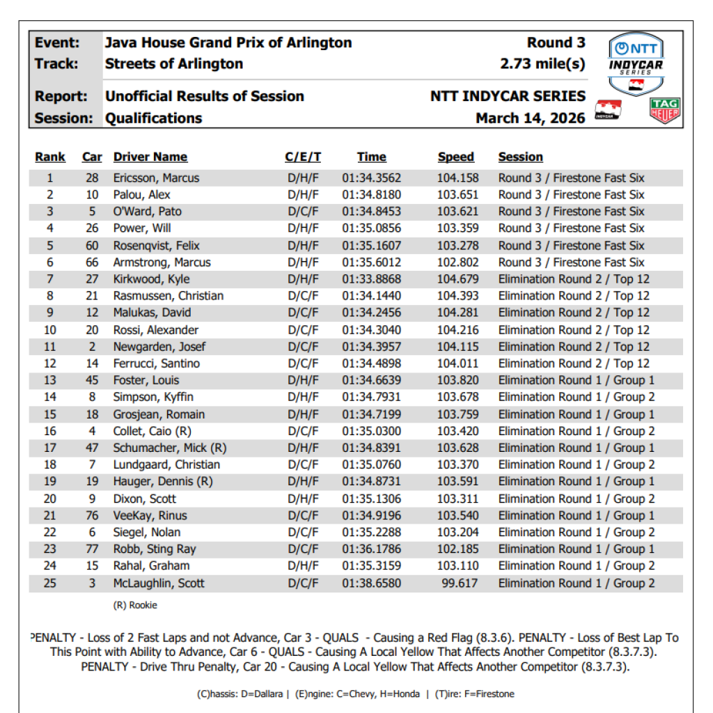 O’Ward ganhou velocidade ao longo da volta e cruzou a linha de chegada com 1m34s845, o que foi suficiente para o terceiro lugar e garantiu a Ericsson outra largada na primeira fila, após ter se classificado em segundo lugar em São Petersburgo.