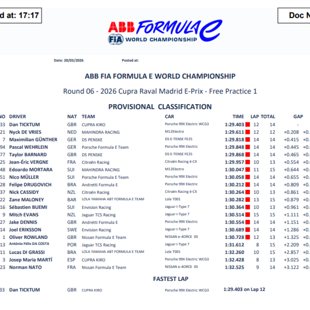 Saindo ileso de uma passagem pela brita no final da prova, Dan Ticktum liderou o primeiro treino livre do E-Prix de Madrid da Fórmula E, em Jarama.