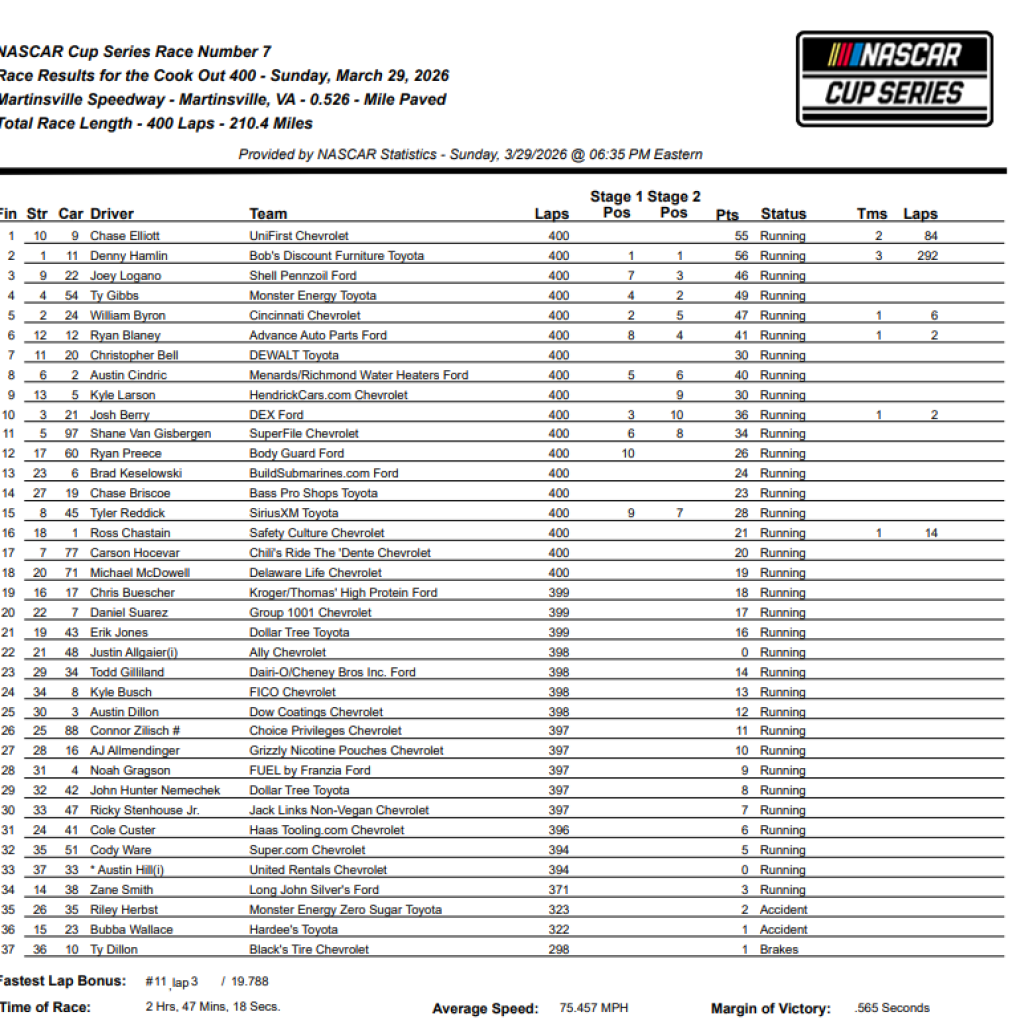 William Byron, da Hendrick Motorsports – tricampeão em Martinsville – terminou em quinto lugar após liderar seis voltas com o Chevrolet nº 24. Ryan Blaney, da Penske, Christopher Bell, da JGR, Austin Cindric, da Penske, Kyle Larson, da Hendrick, e Josh Berry, da Wood Brothers, completaram os dez primeiros.