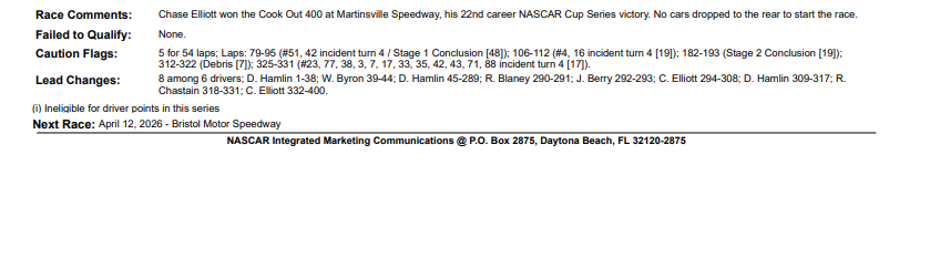 Uma boa estratégia de pit stop e uma equipe altamente motivada levaram Chase Elliott, da Hendrick Motorsports, à vitória na Cook Out 400 da NASCAR Cup Series, no domingo, no Martinsville Speedway. O atual piloto mais popular da categoria deu à Chevrolet sua primeira vitória na temporada, para a alegria de uma enorme e entusiasmada multidão presente no histórico circuito de meia milha.