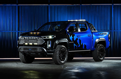 A caracterização traz, além da nova cor, adesivos com figurino preto perfazendo quase uma lógica dois tons e fazendo a dianteira ainda maior, composto ainda por um capô exclusivo com iluminação âmbar e luzes de led instaladas na grade dianteira, tornando-a mais robusta e infinita. O DNA Ram e o reconhecido histórico de personalização Mopar são encontrados em todos os detalhes deste conceito.