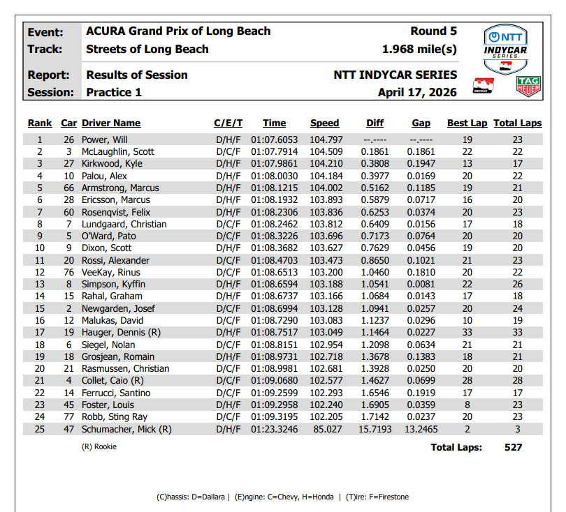 O atual campeão da prova, Kyle Kirkwood, reforçou o ritmo da Andretti ao marcar o terceiro tempo mais rápido com o Honda nº 27, a 0,1917s de McLaughlin, deixando Alex Palou, da Chip Ganassi Racing, e Marcus Armstrong, da Meyer Shank Racing, completando os cinco primeiros.