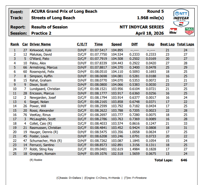 Kirkwood, atual campeão de Long Beach e vencedor de duas das últimas três corridas neste circuito de rua de 11 curvas e 3,164 km, largando da pole position, liderou esta sessão abreviada com o tempo de 1 minuto e 7,5417 segundos no carro nº 27 da JM Bullion/Gold.com Honda da Andretti Global. Foi o melhor tempo entre as duas sessões de treinos livres realizadas até o momento neste fim de semana.