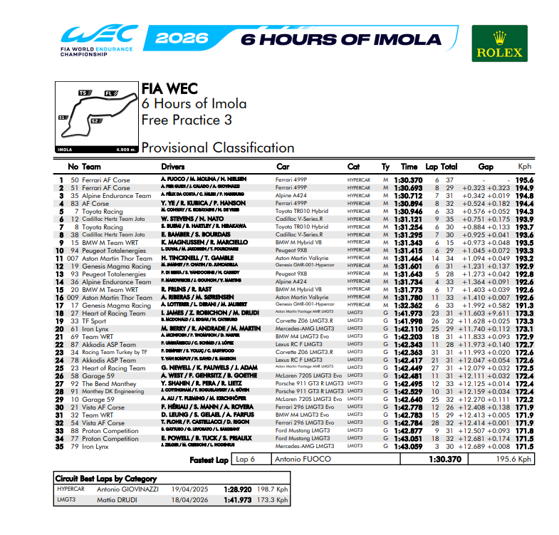 Os Ferrari 499P de fábrica dominaram a tabela de tempos na última sessão de treinos livres do fim de semana de abertura da temporada do WEC em Ímola. Antonio Fuoco colocou o carro nº 50 no topo da tabela com um rápido tempo de 1m30s370, usando pneus macios Michelin. O carro irmão, nº 51, também registrou um tempo abaixo de 1m30s, graças à volta rápida de Antonio Giovinazzi, que garantiu a segunda posição.