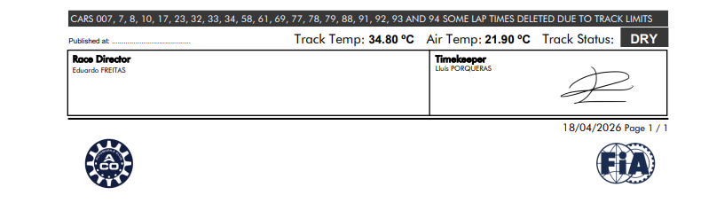 “Vamos ver como corre. Sabemos que a competição será renhida. A disputa está cada vez mais acirrada, mas é bom estar lá em cima. Faremos o nosso melhor para retribuir o apoio que recebemos em Ímola”, disse o piloto do carro nº 50, Miguel Molina, após a sessão, quando questionado sobre as chances da equipe de conquistar a pole position.