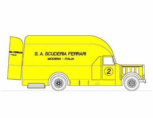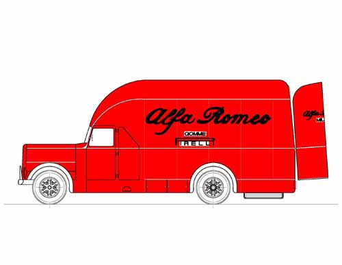 Os transportadores Ferrari e Alfa Romeo baseados em NAG Bussing, desenhados por Mike Sells, são baseados em fotografias, então provavelmente não são totalmente precisos de acordo com o artista. O transportador da Ferrari foi visto em 1936 e só foi usado em 1936 e 1937, antes que o Alfa Corse assumisse. O transportador com o logotipo Alfa é mostrado em seu disfarce de transporte Alfetta de 1946-1951. (© J. Michael Sells)